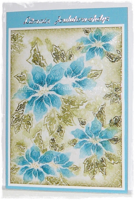 Kohokuvioin kirkkaalla jauheella kukkataustan ja levittelin musteita sinne tänne. Suihkuttelin kuvan kauttaaltaan vedellä ja kuivasin sen. Sitten mustetin reunat ja kohojauhetin koko alueen. Kuvakulma taas outo... hiukan kimaltava on tuo pinta ;) *** I embossed this flower background with clear powder and swiped some inks on it. I sprayed water on it and dried it properly. Then I inked its edges and embossed whole area with clear powder.
